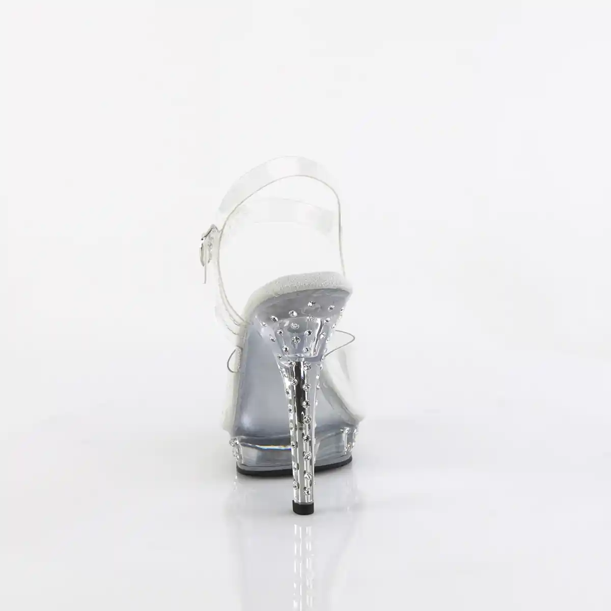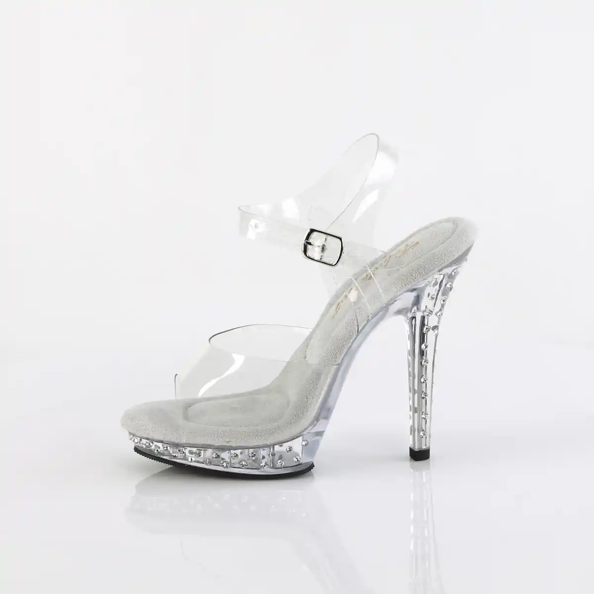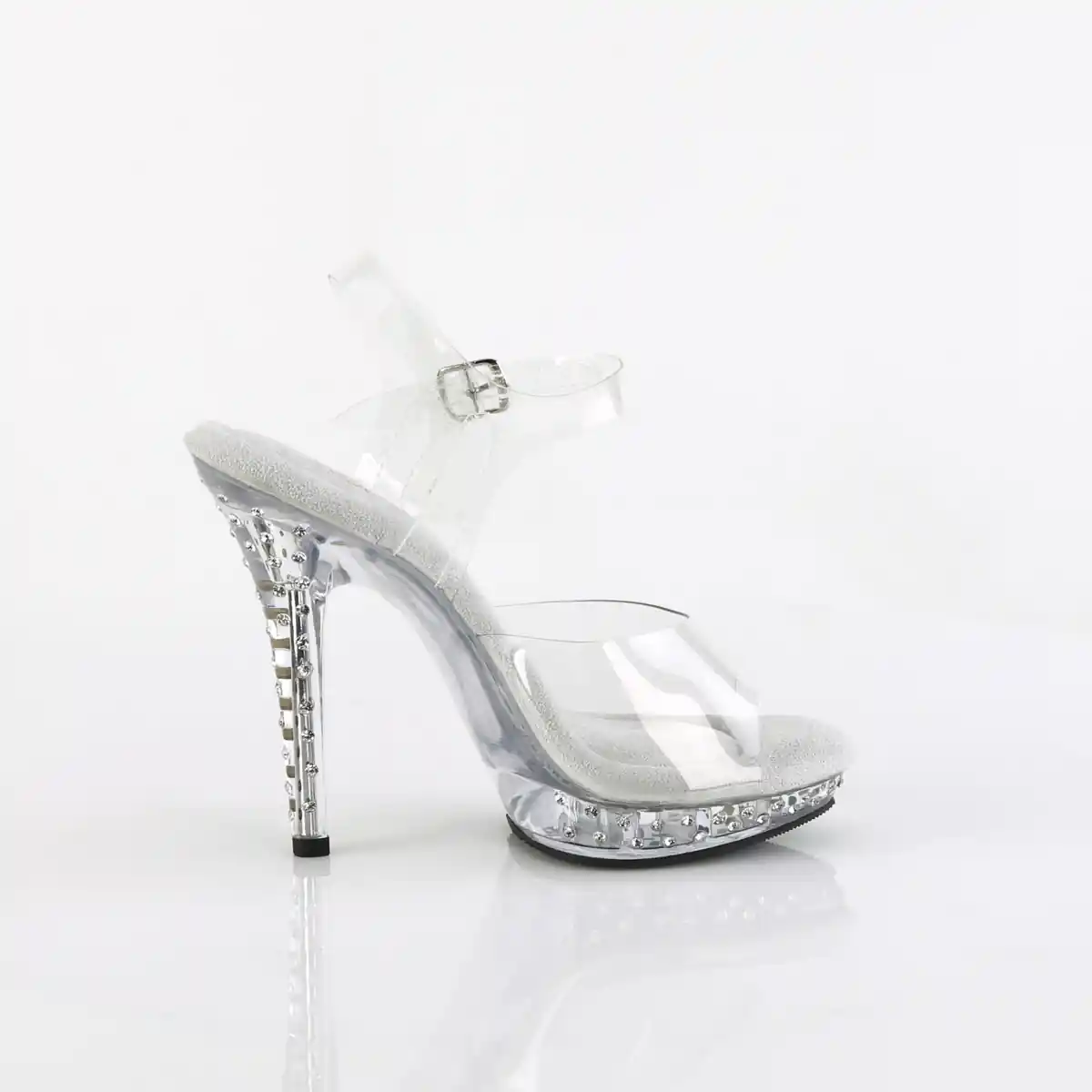 5″ Heel, 3/4″ Platform Ankle Strap Sandal Featuring Rhinestones Studded on the Heel and Platform Bottom.
